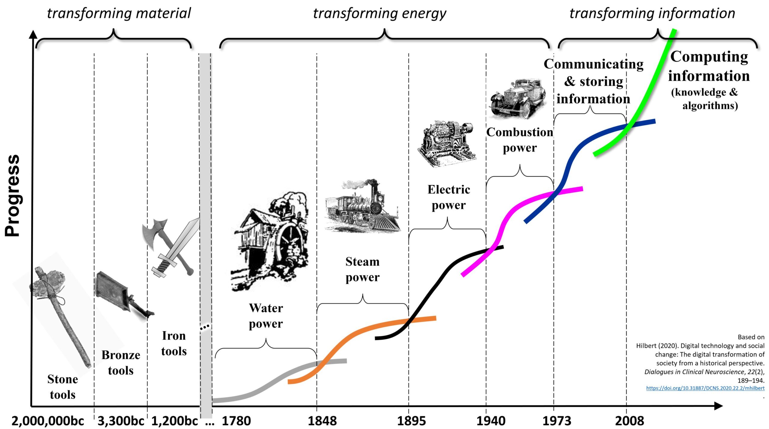 Šmihulos technologijų bangos. Danielis Šmihula 2009-aisiais žurnale „Studia Politica Slovaca” (1/2009, pp. 32–47) identifikavo šešias technologijų revoliucijų bangas nuo Viduramžių – kiekvieną trumpesnę nei ankstesnė, atspindint spartėjantį inovacijų ciklą. Svarbiausia jo idėja: šeštosios bangos – informacijos ir robotikos revoliucijos – transformacija artėja prie kulminacijos, ir su ja ateina gilesnė struktūrinė pertvarka nei bet kuri ankstesnė, nes protinio darbo ekonomika yra platesnė nei bet kuri ankstesnė technologinė bazė.